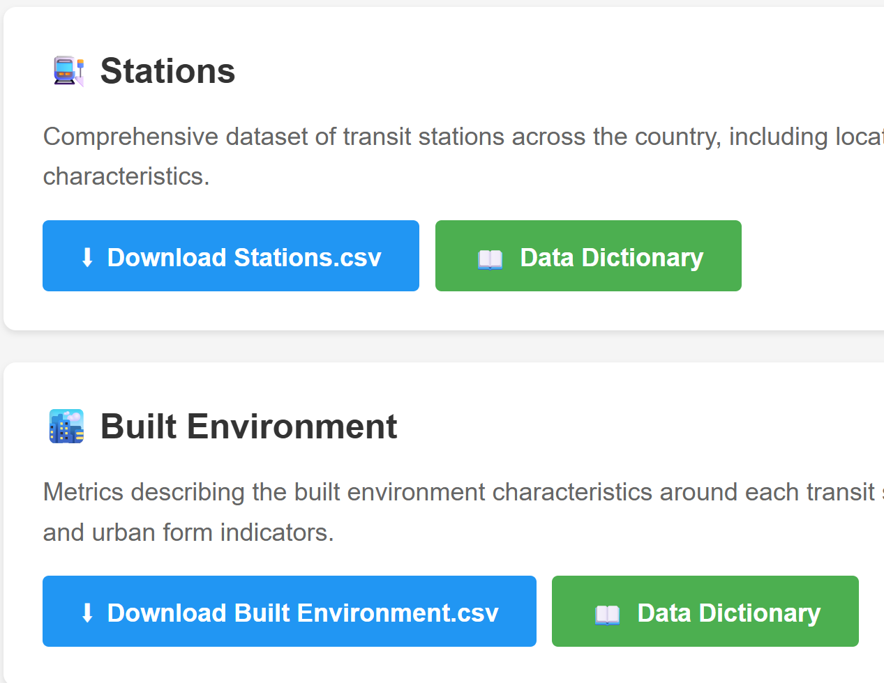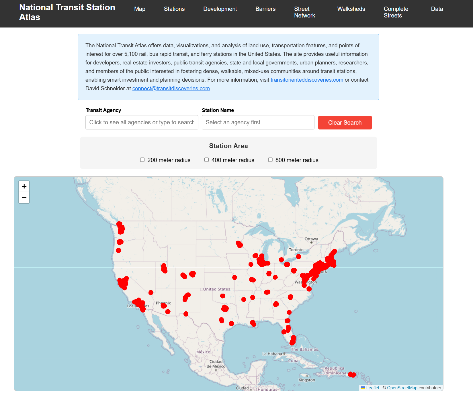 Each transit station is a nexus of possibility—a place where people, land use, transportation networks, and urban design converge. The National Transit Station Atlas meticulously documents each station’s features and maps the physical landscape surrounding transit infrastructure. This allows us to uncover opportunities for improving mobility and create more connected, equitable, and sustainable transit-oriented environments.