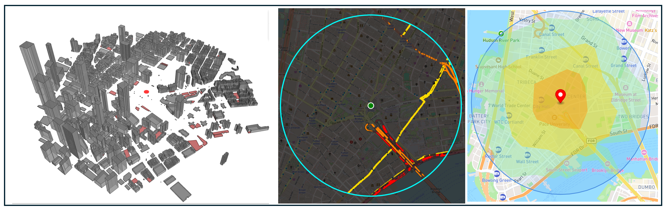 National Transit Atlas maps of the area around the Brooklyn Bridge/City Hall station showing building density, existing highways and arterial roads, and walksheds.