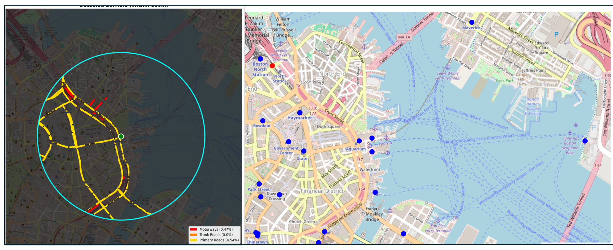 The Big Dig’s transit outcomes parallel what we saw at the Embarcadero. The Central Artery's removal restored pedestrian connectivity across a corridor that had been severed for fifty years. The barrier analysis shows most of the roads adjacent to the Aquarium Station reclassified from freeway-level obstacles to crossable streets in the Big Dig corridor, with only the few sections where the Central Artery surfaces from underground registering as hard barriers. Sixteen MBTA transit stations fall within walking distance of the Rose Kennedy Greenway, along with ferry stops connecting to neighborhoods across Boston Harbor.