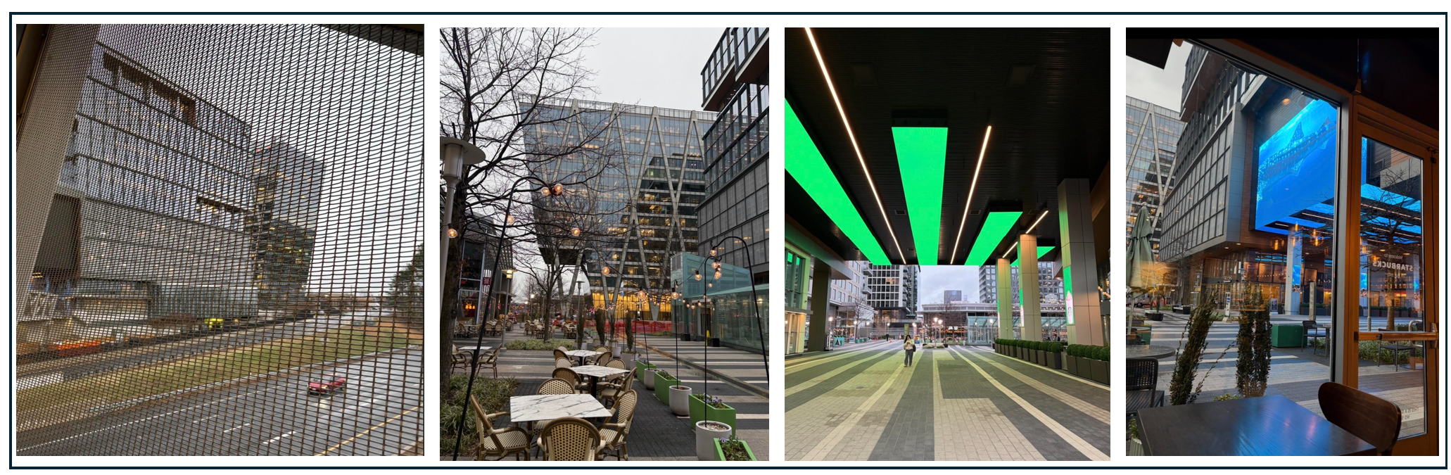I took the Silver Line from downtown DC to Wiehle-Reston East on a raw morning in March. The final leg of the trip from the Spring Hill Station to the east took longer than between the previous stops as Wiehle Reston is spaced further out on the line. After traveling the Dulles access road for what seemed like more than five minutes, I could see the development looming like an enormous silver trapezoid or a Noah’s Ark. I exited the station, crossed the covered bridge over the highway and stepped through a neon lit passageway into a pleasant courtyard with restaurants, tables, and grass surrounded by glass and steel. A soulful John Mayer tune played through the speakers, presumably to create a mood. The highway was out of sight, but not out of earshot, as the whoosh and rumble of cars and trucks mingled with the piped in music.