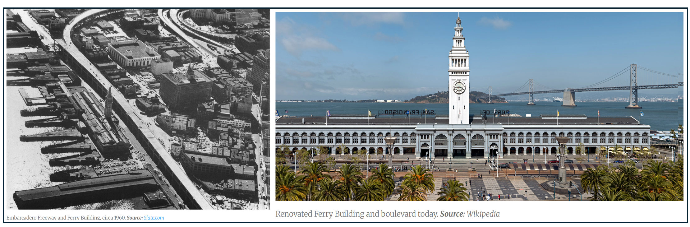 The elevated embarcadero freeway next to the Ferry Building (left) and the embarcadero boulevard adjacent to the renovated Ferry Building (right). Images from CNU