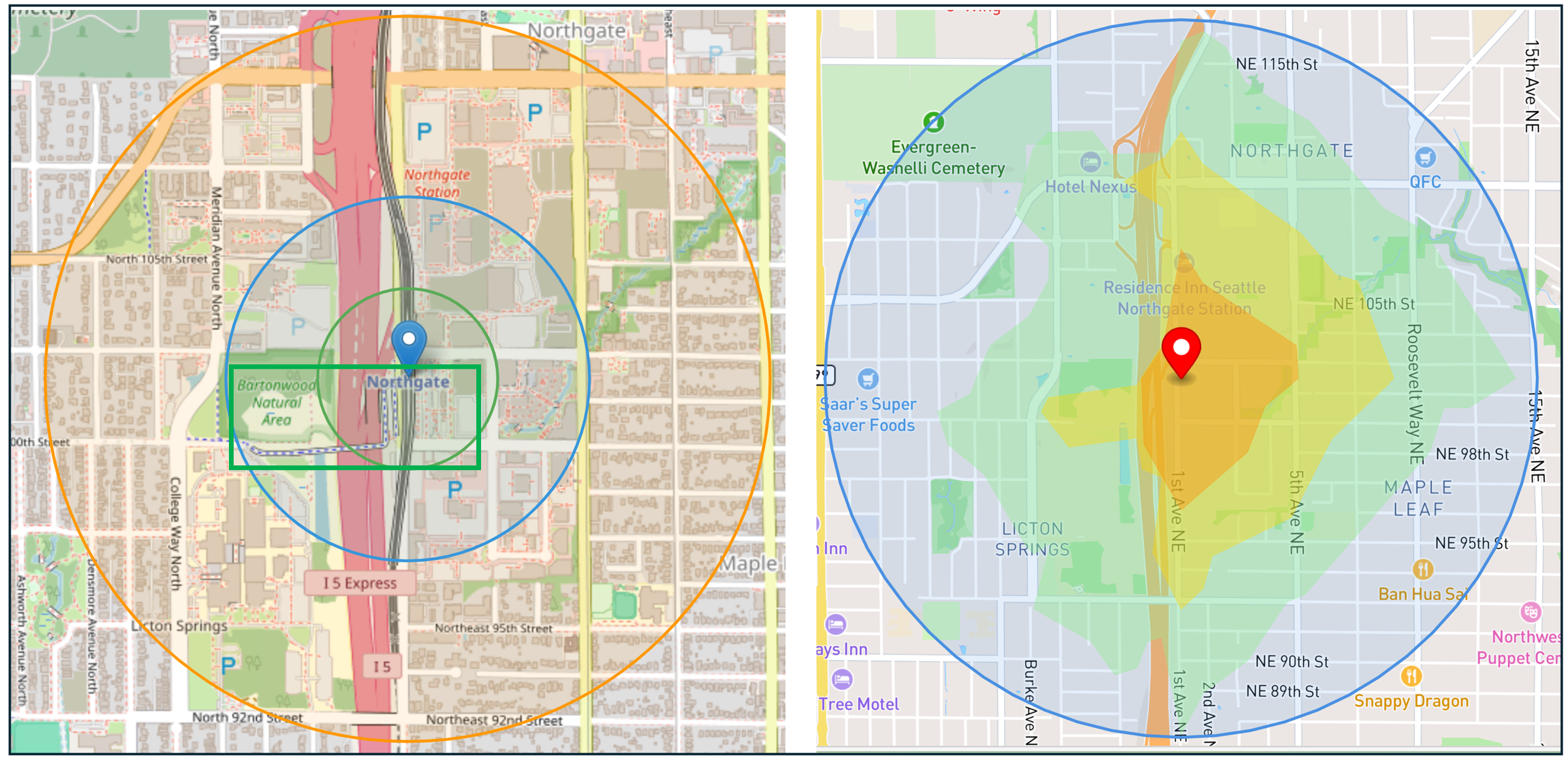 Left: A National Transit Station Atlas map of the Northgate station that highlights the John Lewis Bridge. Right: The walkshed map identifying that 0.92 square miles of land is available within a 15-minute walk, including large sections of land across the highway from the station.