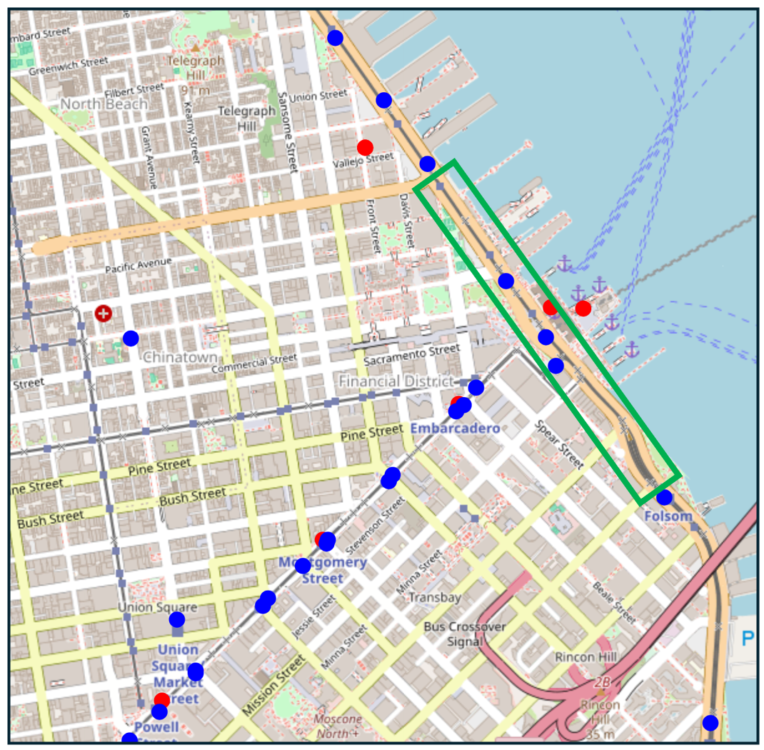 An image of downtown San Francisco with the Embarcadero highlighted in green. Blue dots represent Muni stations and red dots represent transit stations operated by other agencies.