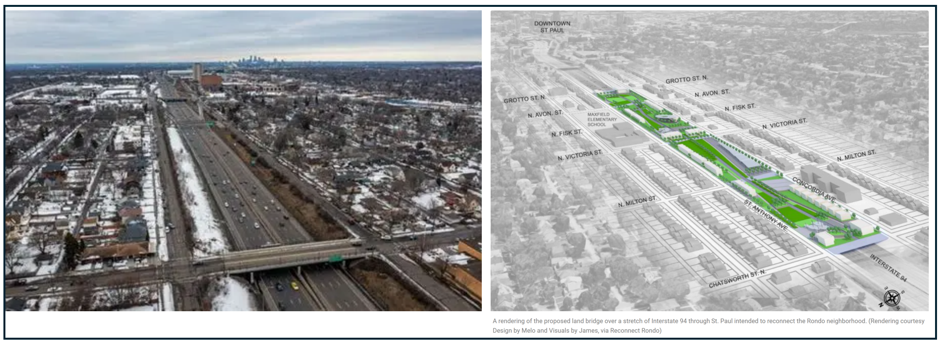 Left: a portion of Interstate I-94 through St. Paul source. Right: a rendering of the Rondo Land Bridge (right). Source: Reconnect Rondo.