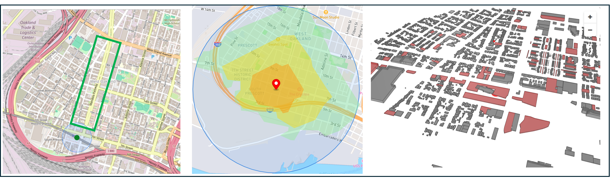 Lef: the Mandela Parkway, bordered in green, adjacent to the West Oakland BART station. Center: land accessible within a 5, 10, and 15 minute walk from the station shaded in orange, yellow, and green compared to the theoretical maximum distance a person could walk in any direction if no barriers existed (the light blue circle). Right: parking lots and garages (shown in red) within ½ mile of the station.