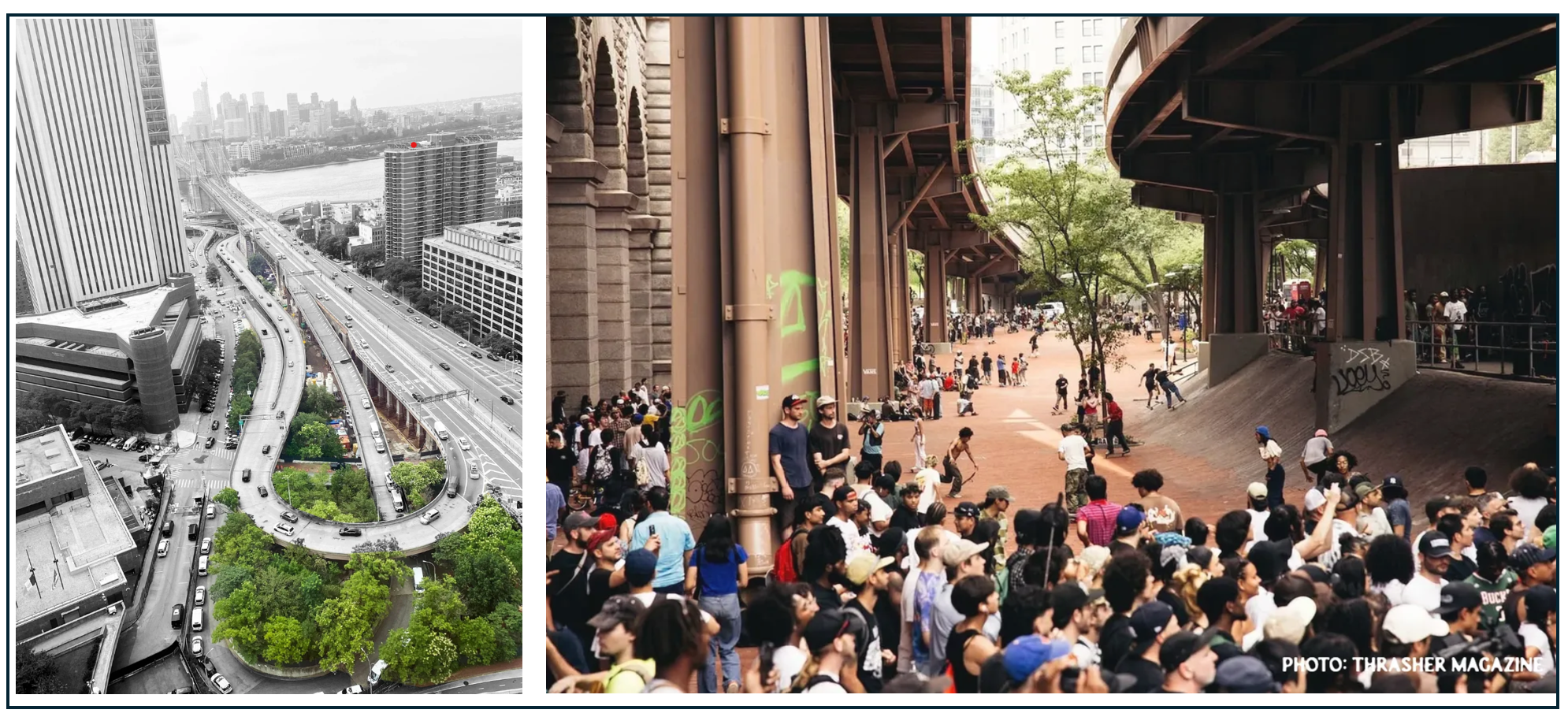 A rendering of Gotham Park (left) and the 2025 re-opening of the Brooklyn Banks skatepark, a portion of the overall vision for the park.