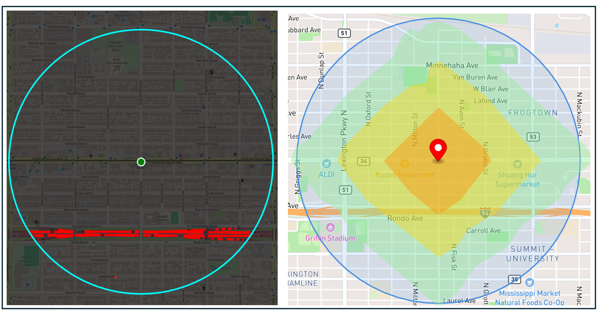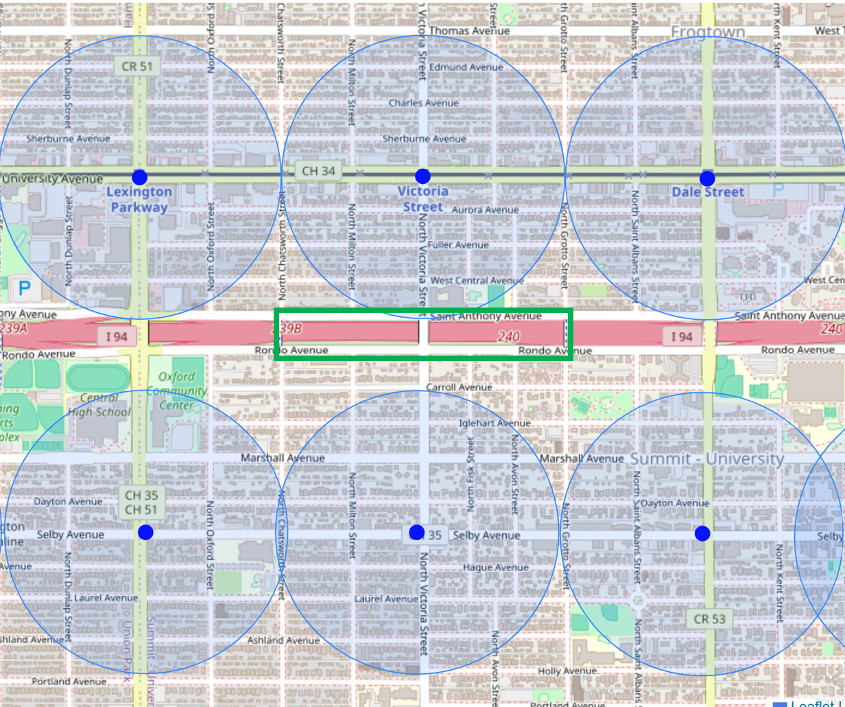Three Green Line light rail stations sit immediately north of the proposed land bridge, and three B-Line bus rapid transit stations anchor the corridor to the south. The transit infrastructure, in other words, is already there. What the freeway trench has done is compress the effective walkshed of those stations on their southern flank — the Atlas's isochrone analysis shows that portions of the neighborhoods south of I-94 currently fall outside the ten-minute walkshed of Victoria Station, not because the distance is too great but because the crossing points are limited.